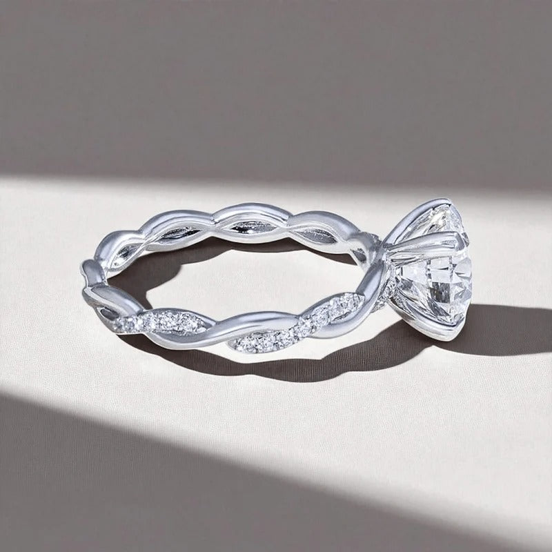 The Twisted Love Solitaire Ring is a timeless expression of romance, featuring a 2 Ct round lab-grown diamond held by delicate heart-shaped prongs. The twisted shank, adorned with pavé-set diamonds, creates a graceful silhouette that symbolizes two lives intertwined. Crafted in platinum, this design blends classic brilliance with heartfelt detailing, making it the perfect choice for a meaningful engagement.